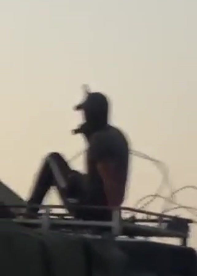 A man in dark clothing, including a baseball cap and what appears to be a face covering, is seated on the roof rack of a vehicle
