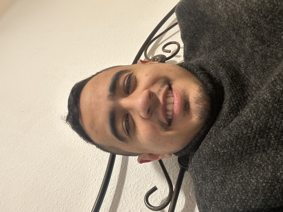A man smiles at the camera while lying in bed. He has short, dark hair, brown eyes, and stubble on his face. He is wearing a dark grey turtleneck sweater. The background is a plain white wall and a decorative wrought iron headboard. The image is rotated slightly counterclockwise.