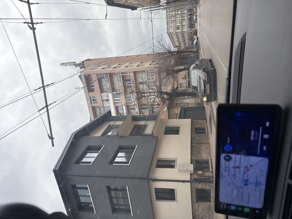 The image depicts an urban street scene in Vratsa, Bulgaria, observed from the interior of a vehicle on an overcast day