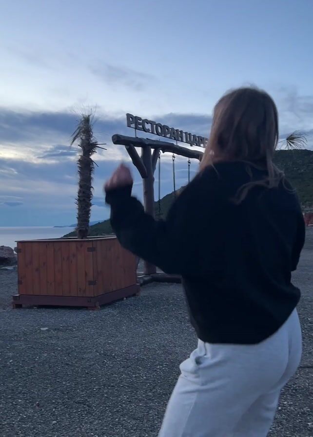 A young woman is dancing alone in an outdoor location at dusk. She wears a black sweatshirt and grey sweatpants, with black sneakers. In the background, a sign that reads "РЕСТОРАН ЦАРЕВИЧ" stands near a decorative wooden structure with swings hanging from it. A faux palm tree stands near a wooden box. The ocean stretches out in the distance under a cloudy sky. The ground is covered in grey gravel. A partial view of a car's side mirror is visible on the left side of the frame. The woman is facing away from the camera, moving her arms and body rhythmically to the music.
