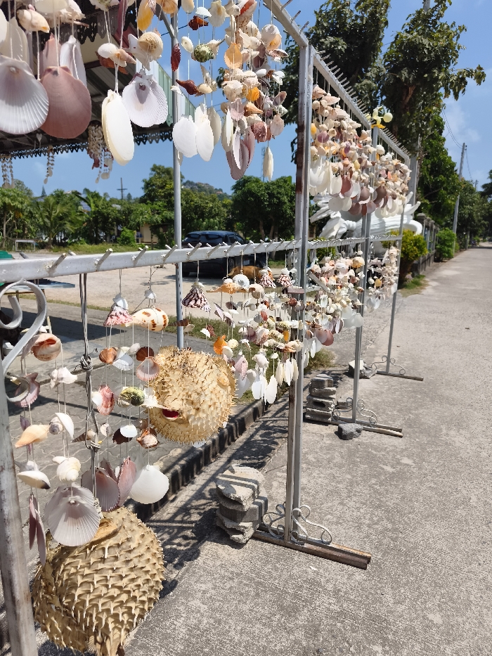 Seashell decorations hang from metal racks on a sunny day. The decorations feature various shells and even preserved pufferfish. The racks line a concrete walkway alongside a road. Trees and buildings are visible in the background, adding depth to the scene. The decorations sway gently, creating a whimsical display.