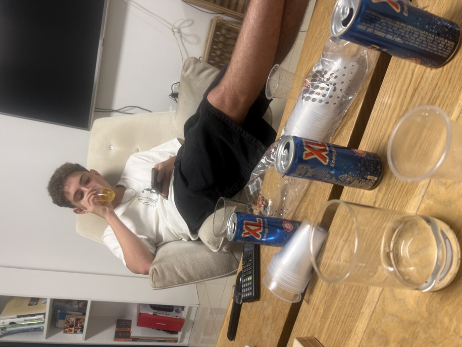 A young man lounges in a white armchair, sipping from a glass and holding a phone. The scene suggests a gathering. A wooden table is cluttered with empty "XL Energy Drink" cans, a stack of plastic cups, and several empty glasses. A remote control rests on the table. Behind the man, a TV is mounted on the wall. A bookshelf is visible below.