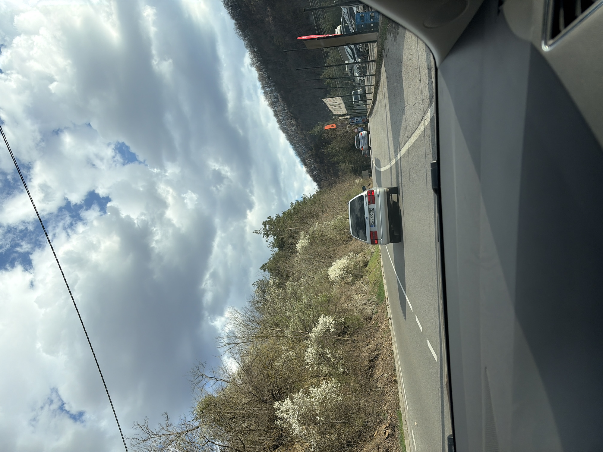 A car is driving on a road in Redina, Bulgaria, with a white van in front. The surrounding environment includes a forested hillside with trees and flowering bushes. The sky is cloudy. Additional cars and roadside structures are visible further down the road.