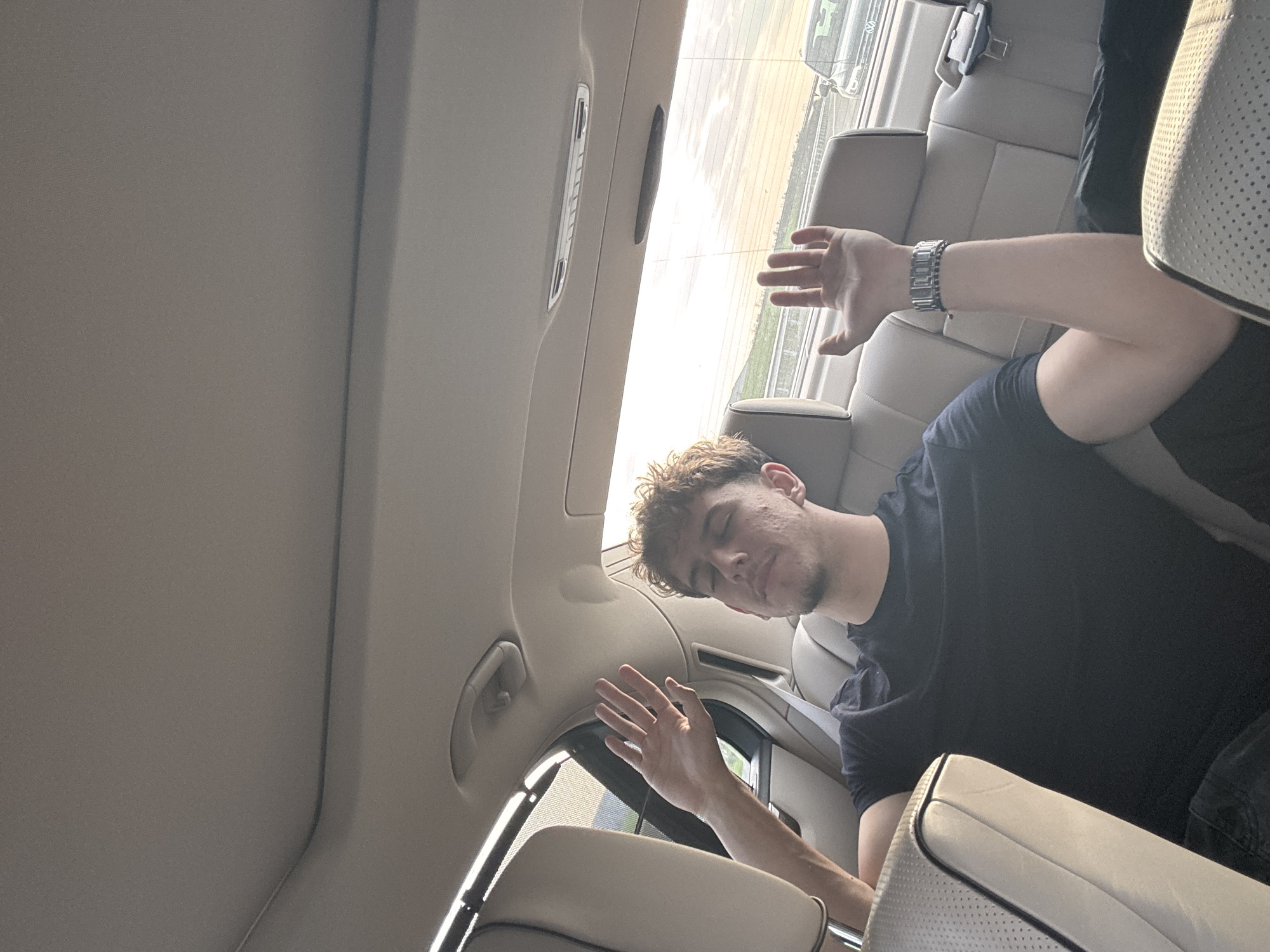 An image captured from inside a vehicle's rear passenger compartment depicts a single male individual. The location is Polsko Padarevo, Bulgaria. The man, appearing to be in his 20s or early 30s with short, light brown curly hair, is seated in the rear passenger-side seat. He is wearing a dark, short-sleeved t-shirt and dark trousers. A silver-toned metal link wristwatch is visible on his left wrist. His eyes are closed, and his head is tilted back. Both hands are raised to head height with palms facing forward, fingers slightly splayed. The vehicle interior features light-colored, possibly beige or light gray, leather seats with perforated accents and a matching ceiling. A sunshade is partially visible on the left rear passenger window. Through the rear windows, an outdoor scene unfolds, showing a multi-lane roadway or highway with a grassy median or shoulder under a warm, diffused light, indicative of either sunrise or sunset. Another dark-colored vehicle, possibly a Volkswagen, is visible on the road in the distance through the right rear window.