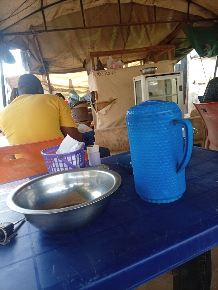 The scene depicts an informal outdoor or semi-outdoor eatery located in Abuja, Nigeria