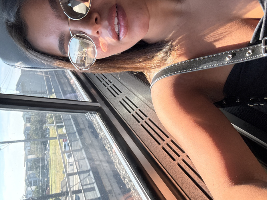 The image depicts a close-up view from inside a rail vehicle, featuring a female subject and an exterior urban environment. The subject, positioned on the right, has medium brown hair and wears oval, reflective sunglasses obscuring her eyes. Her lips are slightly parted and appear moisturized. She is wearing a dark, possibly black, top or dress, with a prominent dark strap featuring silver eyelets/buckles and light stitching visible over her right shoulder. Her exposed right arm and shoulder are illuminated by direct sunlight entering from the left, casting a warm, orange-tinted light. The interior of the vehicle shows a gray seatback behind her and a beige or light brown paneling below the window with horizontal vent slats. Through the window on the left, an exterior scene under a clear blue sky is visible. Immediately adjacent to the vehicle are multiple parallel railroad tracks set in gravel. Beyond the tracks, a low concrete barrier separates the railway from a paved road. On this road, a white SUV and a red circular stop sign are present, next to a metal guardrail. Further in the background, a dry grassy area with sparse trees precedes several rows of multi-story, light-colored residential buildings or townhouses. This scene is identified as the **Ironbound neighborhood of Newark, New Jersey, United States**, consistent with views from a train traveling along the Northeast Corridor through this urban development.