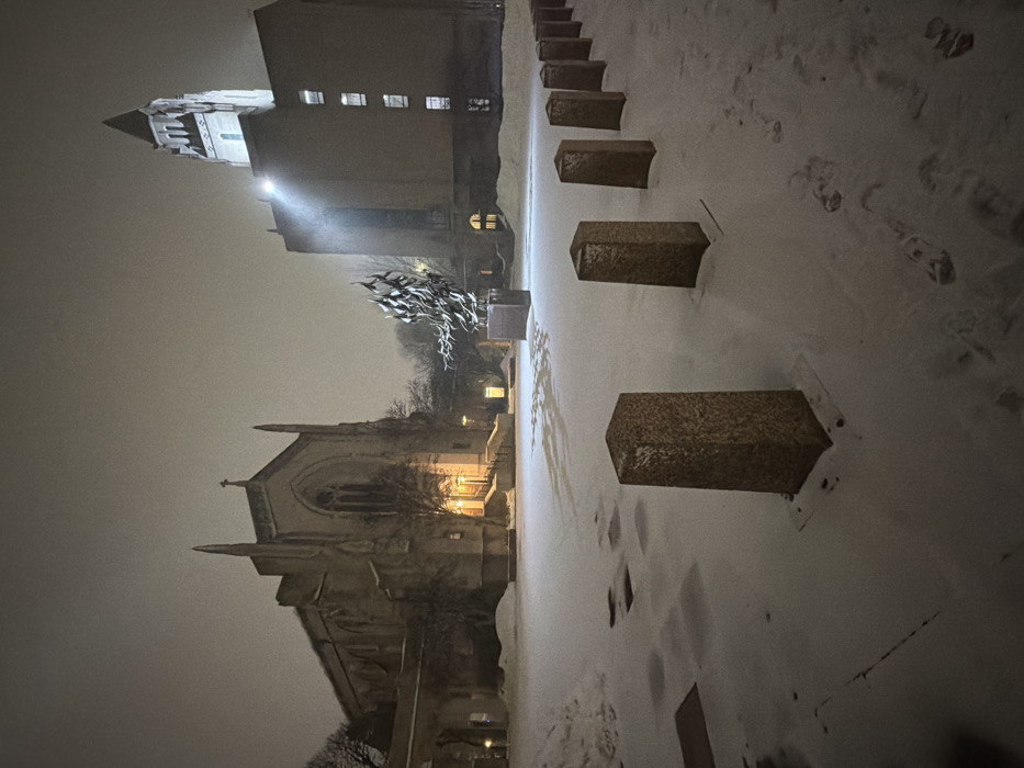 - "At night, a snowy scene reveals two prominent buildings: a church with gothic architecture and a taller, modern structure" by FM-GXE8f1, licensed under CC BY 4.0