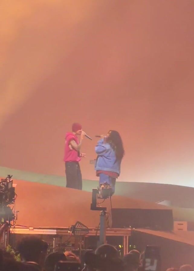 Two individuals, seemingly performers, are standing on a stage, illuminated by a concert-style lighting system. The individual on the left wears a pink tank top and a red beanie, while the individual on the right wears a blue jacket. Both are holding microphones. Behind them is a multi-tiered stage backdrop featuring varying shades of brown and green. A dense crowd, holding up phones to record the performance, is visible in the foreground. A camera operator with a lighting rig is present on the left. The stage lighting shifts in color throughout the video, altering the overall ambiance of the scene.