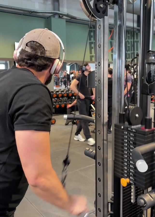 - "A man in a black t-shirt, a backwards baseball cap, and pink headphones is doing a tricep pushdown at a cable machine in a gym" by FM-i0fjc2, licensed under CC BY 4.0