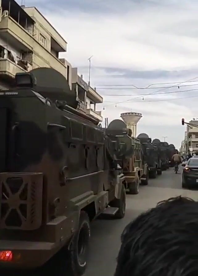 convoy of military vehicles, presumably armored personnel carriers (APCs), driving down a city street