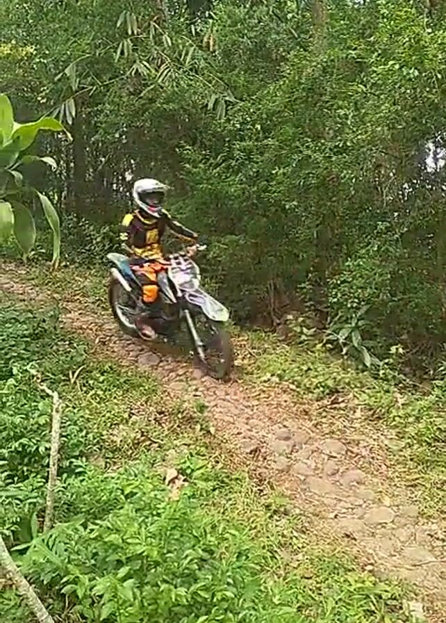 The video depicts two individuals riding motorcycles on a dirt path through a forest