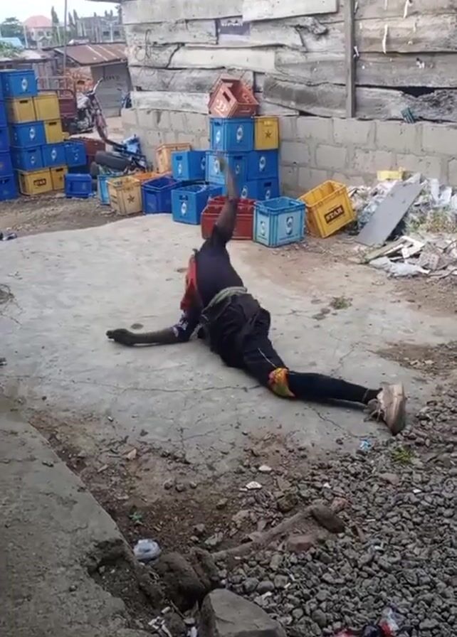 person lying on the ground in an outdoor area. The person is wearing dark clothing, shoes, and a head covering. They are lying on a concrete surface that is stained and dirty. The person is making movements, including moving their arms and legs. Around them, there are stacked crates of various colors, a motorcycle parked in the background, some trash, and a gravelly area. The surroundings look like a semi-urban or commercial area with buildings made of corrugated metal or wood.