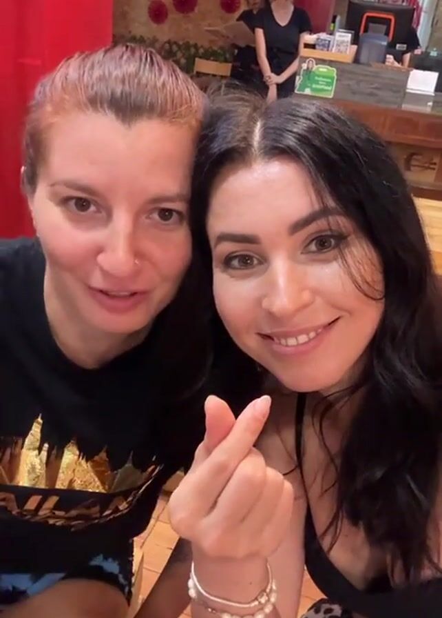 Two women are taking a selfie in what appears to be an Asian-themed restaurant. One woman has auburn hair pulled back and is wearing a black t-shirt with a gold skyline design. The other woman has long, dark hair and is wearing a black top with thin straps. They are both smiling and making the "finger heart" gesture. In the background, two female employees are visible behind the counter, one operating a point-of-sale system. The restaurant has red walls, wooden furniture, and decorations including paper lanterns and artificial cherry blossom branches.