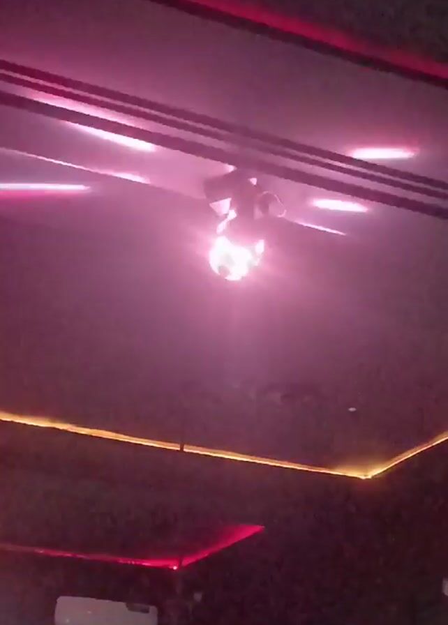 ceiling of what appears to be a dance club. There is a disco ball in the center of the ceiling, and there are colored LED light strips running along the ceiling in a geometric pattern. The colors change, transitioning between red, yellow, green, and purple. An air conditioning unit is visible along one wall. Music is playing in the background.