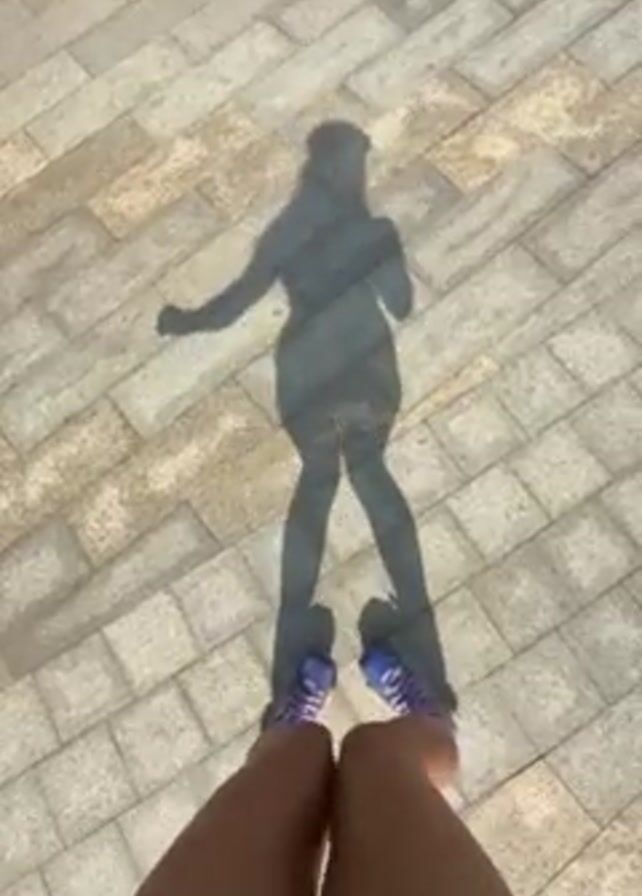 first-person perspective of someone wearing roller skates on a paved surface. The pavement is made of rectangular blocks in varying shades of grey and light brown. The person is wearing dark shorts. The shadow of the person is visible on the ground, showing them with their arms slightly extended and in a casual stance. They are lightly shuffling their feet while wearing the roller skates. The skates are purple with yellow wheels. The shadow suggests the person has a hat or hair bun on top of their head.