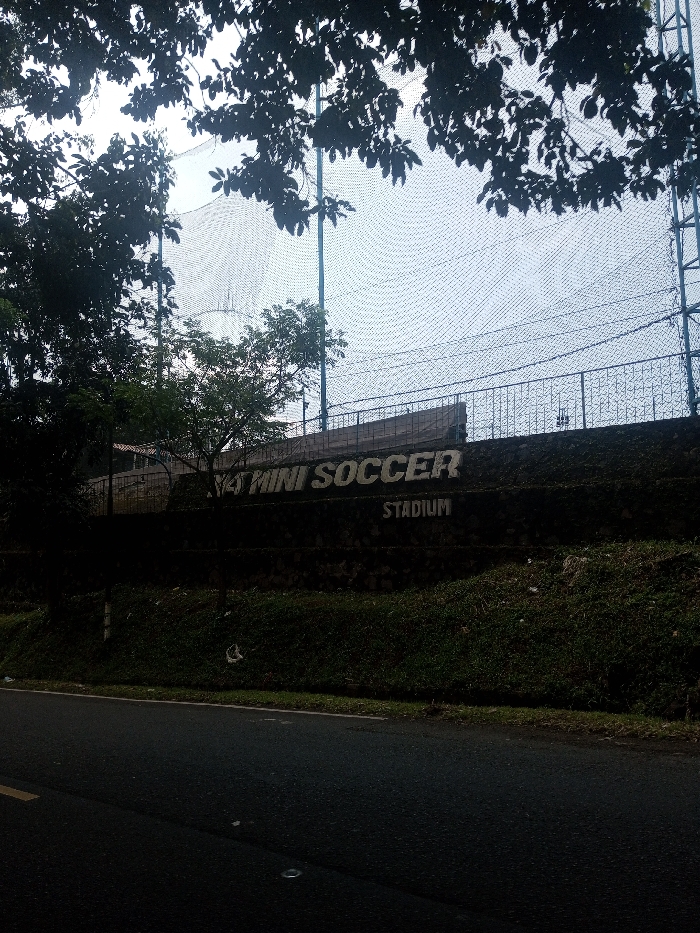 This image depicts an outdoor scene in Niz Lakuk, India, showing a ground-level view of a sports facility. The foreground features a dark asphalt road with a partial yellow demarcation line on its left edge. Adjacent to the road, a dark green, uneven earth embankment slopes upwards, covered in grass and some light debris. Overhanging dark, silhouetted tree foliage frames the upper left and top portions of the image. In the midground, a weathered, multi-tiered concrete or stone retaining wall is prominent. Painted on this wall in white capital letters are the words "45 MINI SOCCER" in a large font, with "STADIUM" positioned directly below in a smaller font. The wall exhibits signs of aging, including dark stains and patches of moss. Above the retaining wall, a dark metal railing runs horizontally. Beyond the railing and extending upwards, a large, black, fine-mesh netting structure is visible, supported by several vertical poles. This netting encloses what is presumed to be a sports field. The sky, partially visible through the netting and foliage, appears bright and overcast, providing diffused illumination to the scene. No individuals or active subjects are present in the image.