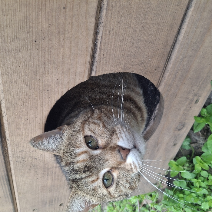 The image displays a domestic tabby cat with brown, grey, and black striped fur and green-hazel eyes. The cat's head and upper body emerge from a circular opening in a light brown wooden structure, which is constructed from horizontal planks. Prominent white whiskers extend from the cat's muzzle, and its gaze is directed slightly downwards and to the left, towards the viewer. The wood exhibits visible grain and minor surface irregularities. In the lower-left foreground, green foliage, consisting of small plants, is visible on the ground. This outdoor scene is observed in the city of Plovdiv, Bulgaria.