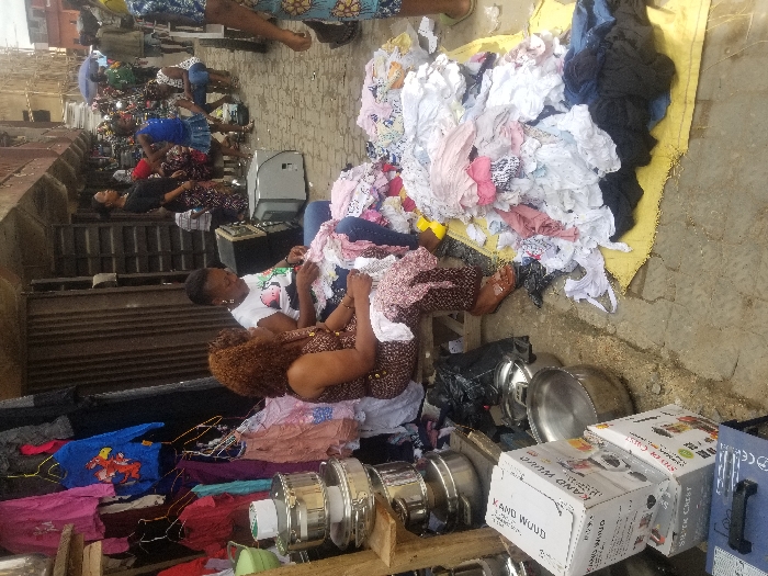 The image depicts a bustling outdoor market scene within a dense urban area of Lagos, Nigeria. In the immediate foreground, two women of African descent are seated on low stools on a paved surface. The woman on the left has reddish-brown curly hair and wears a patterned sleeveless dress, while the woman on the right has short dark hair and wears a white t-shirt with a graphic design. Both women are actively sorting through large piles of assorted clothing, predominantly children's wear, which are spread on a yellow tarp or mat directly in front of them on the ground. To the left of the seated women, a stack of stainless steel pots or bowls is displayed on a wooden stand. Below these, two cardboard boxes are visible, labeled "KANO WOOD" and "SILVER CREST," suggesting packaged kitchen appliances. Clothes are also hanging on racks attached to a wooden structure immediately behind the pots. Near the women's feet, a black plastic bag rests on the ground, which is composed of light-colored concrete pavers interspersed with dirt. In the midground, a woman in a black top and patterned skirt stands upright, observing the activity. Adjacent to her, a vintage grey CRT television set and a darker electronic device are positioned on the ground. Further down the street, additional individuals are visible, including a young child in a blue dress interacting with an adult. The background showcases a street lined with multi-story commercial buildings constructed from concrete, featuring characteristic corrugated metal roll-up doors. Elements of scaffolding are discernible on a building in the distance, indicating construction or renovation. The overall environment suggests a vibrant, active marketplace.