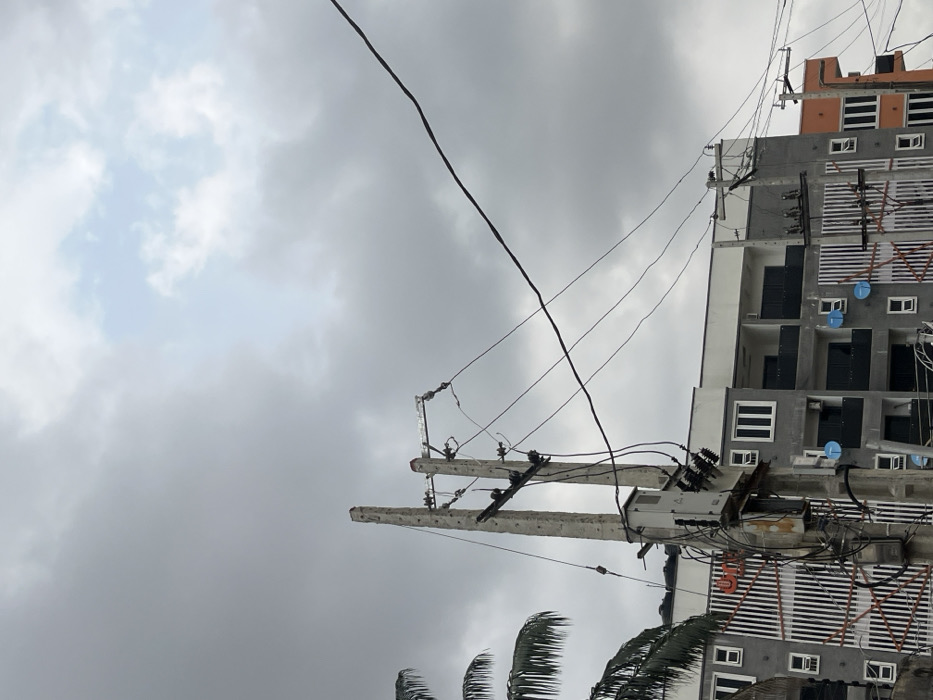 The image displays an urban environment under an overcast sky dominated by grey clouds, with a small patch of lighter sky visible at the top right. In the foreground, two concrete utility poles stand prominently. The rightmost pole is equipped with a grey electrical transformer box, insulators, and a dense configuration of black electrical wires that extend across the frame, connecting to both poles and the background structures. The pole on the left also supports electrical wiring. Partial fronds of a palm tree are visible on the far left. In the midground, a multi-story building, appearing either under construction or recently completed, features a grey facade with white-framed windows and dark balconies. Portions of its exterior display distinctive vertical striped patterns in white and orange/red, and a large orange letter, possibly "U" or "UNI", is visible on its left side. Multiple small, light blue satellite dishes are affixed to this building's facade. To the far right, a segment of another multi-story building with an orange-colored facade and white windows is partially visible. No individuals or specific actions are depicted. The scene’s architecture and utility infrastructure are consistent with urban areas in Lagos, Nigeria.