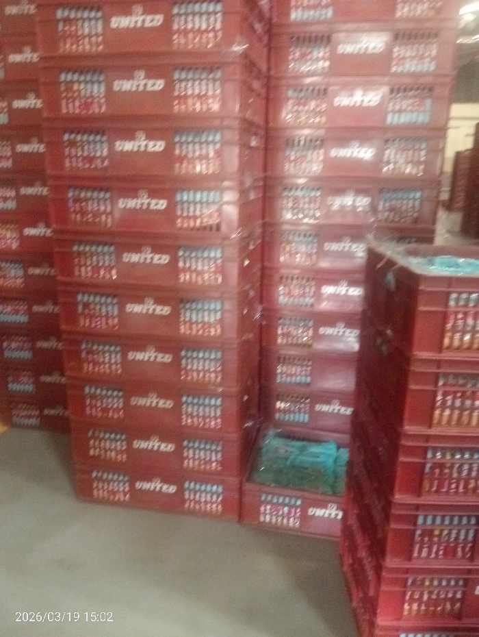 The scene is an indoor storage facility or warehouse, located in Unknown, Unknown. Dominant features are numerous red plastic crates, stacked vertically in dense formations, forming walls that extend beyond the frame both vertically and horizontally. Each visible crate is embossed with the "UNITED" logo. Contents consist primarily of multiple rows of small, uniform bottles, appearing to contain amber-colored liquid. One crate, located near the bottom of a central stack, holds items wrapped in a light blue or green material, distinct from the bottled contents. The floor is a plain, light grey concrete surface. Artificial, somewhat dim lighting illuminates the area. No individuals, actions, or interactions are observable within the depicted scene. A digital timestamp "2026/03/19 15:02" is present in the lower-left corner of the image.