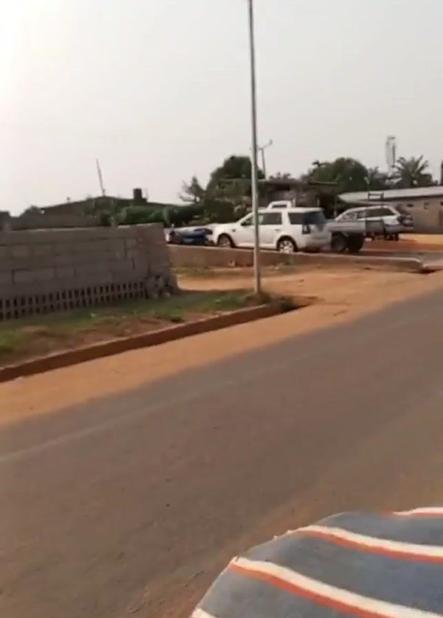 street in a town. It is daytime and the sky is bright. The camera is moving, likely from a vehicle. The street is paved, and there are sidewalks on either side. Several buildings are visible, including houses, shops, and a car wash area with a few vehicles parked there. There are also some piles of construction material, such as bricks and lumber, along the roadside. In one scene, two people are walking along the street. There are also several streetlights lining the road. One scene shows a motorcycle passing.
