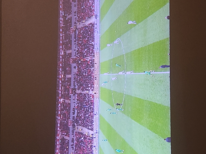 An image shows a soccer field, possibly during a game, from an elevated perspective