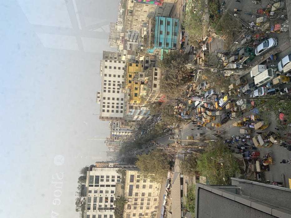 The image presents an elevated, wide-angle view of a densely populated urban street in Narayanganj, Bangladesh, under hazy daylight conditions