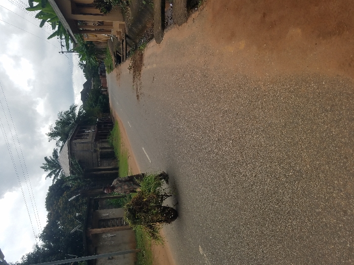 An adult male is observed pushing a single-wheeled wheelbarrow laden with green vegetation along an asphalt road in the city of Unknown, Unknown. The male subject, positioned slightly right of the road's center, wears a camouflage-patterned long-sleeved shirt and trousers. The road surface is asphalt, with a faded white line on the left and a reddish-brown dirt shoulder on the right. To the left, a concrete wall and a two-story building in disrepair are visible, surrounded by dense foliage. To the right, several single-story residential buildings with light-colored facades and reddish roofs line the road, separated by a concrete drainage ditch and utility poles. Overhead power lines traverse the cloudy sky. The environment is characterized by abundant tropical vegetation, including palm and banana trees.
