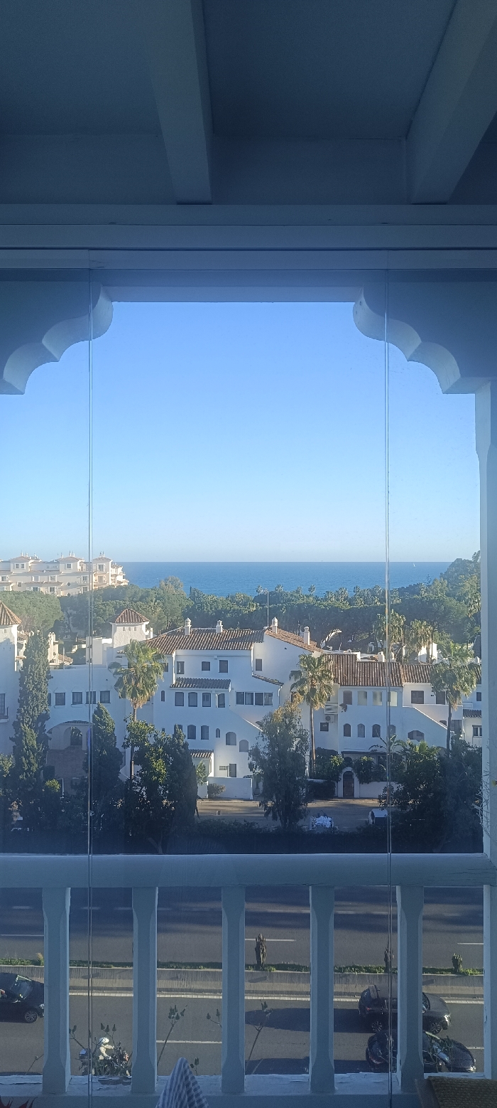 The image displays a clear, high-angle view from a glazed balcony or loggia in Marbella, Spain, overlooking a coastal scene