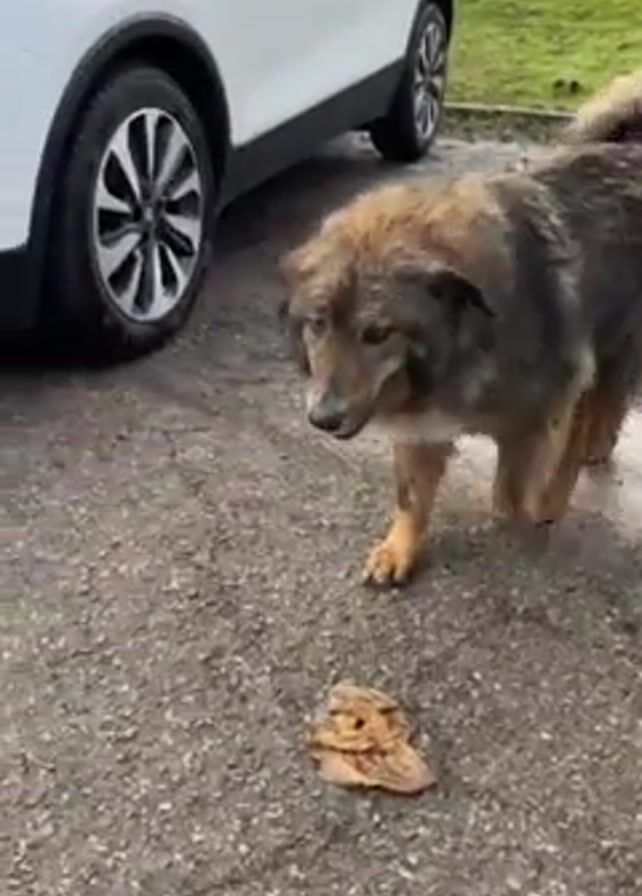 two dogs in an outdoor setting. One is a medium-sized dog with a long, shaggy coat that appears to be a mix of brown, black, and gray. The dog is standing and facing the camera. It then opens its mouth wide in what appears to be a yawn. The second dog's head is only partially visible in the lower right corner of the frame. A white car is parked nearby, and the ground is a mixture of gravel and dirt. There is grass visible in the background.