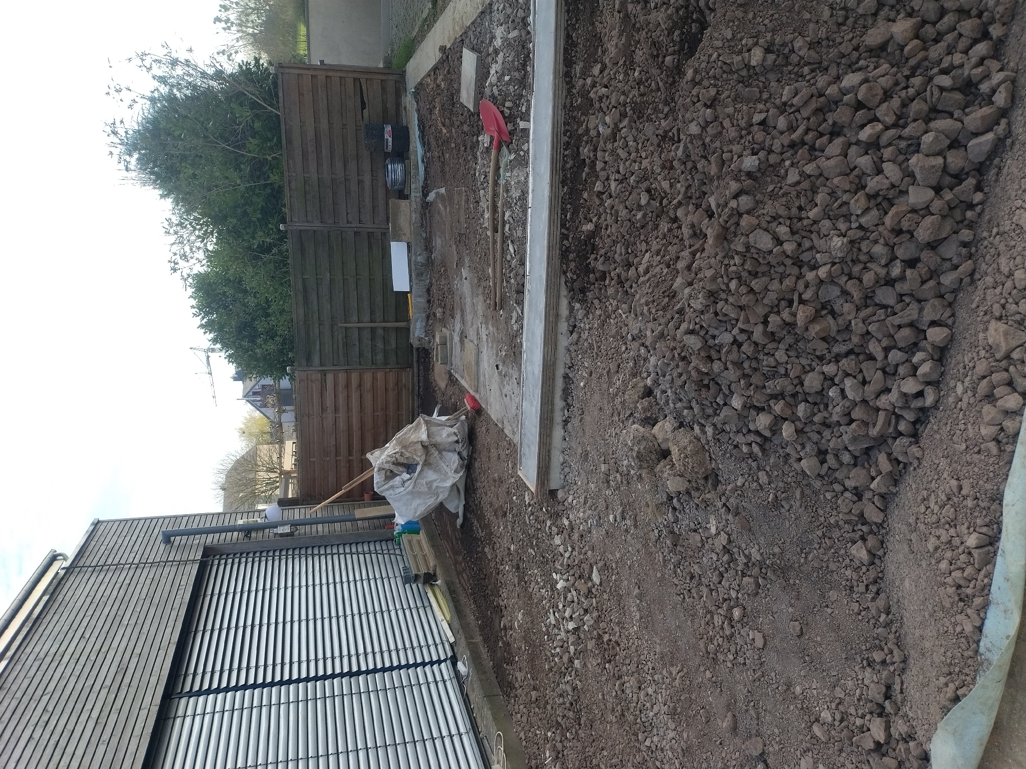 The scene depicts an active landscaping or construction site within a residential area of Crauthem, Luxembourg, viewed from a low angle. The foreground is dominated by uneven, excavated earth mixed with gravel and small rocks, including a prominent mound of aggregate. A light-colored geotextile or tarp lies partially on the ground in the bottom left. To the left, a modern building features horizontal wooden cladding and a large window or door covered by closed metallic louvered blinds. A rain gutter runs along the roofline, and a dark downspout system with an attached white spherical light fixture is visible on the wall. Adjacent to the building's base, a concrete curb separates the structure from the excavated area. Near this curb, construction items include a coiled yellow cable, green and blue plastic containers, and a large white, irregularly shaped tarp or bag. A broom with a red head leans near the white bag. The central area of the site shows disturbed earth, with a partially cleared, flatter section in the middle-ground. Several grey concrete pre-cast elements or slabs are arranged on the ground. A red plastic shovel and a long-handled spade lie horizontally on the gravel. In the background, a weathered wooden slat fence forms a property boundary. Behind the fence, dense green foliage and deciduous trees are visible. To the far right, a narrow paved strip suggests a finished pathway or driveway. In the distant background, a yellow construction crane and residential rooftops can be faintly seen above the tree line. No individuals are present in the image.