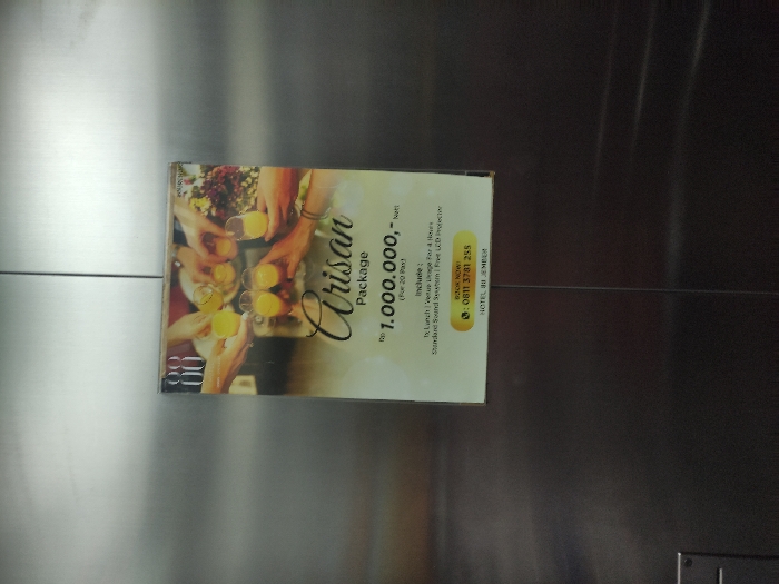 poster advertising a "Chrison Package" for 1,000,000 Indonesian Rupiah. The poster is attached to a stainless steel wall, possibly in an elevator. The poster features a photograph of people toasting with glasses of orange juice. The coordinates provided, -8.172 latitude and 113.698 longitude, correspond to a location in Jember, Indonesia. The poster also includes contact information for booking: "BOOK NOW 0811 5781 255" and "HOTEL, JEMBER."