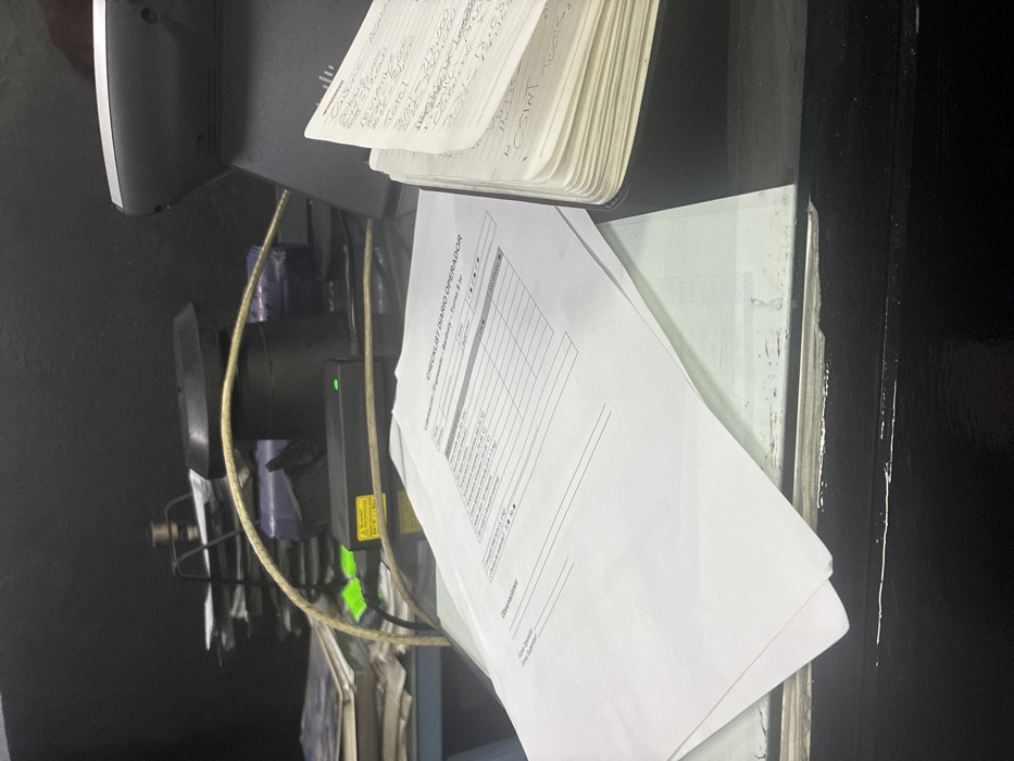 This image captures an indoor workstation or desk environment, located in Cuautitlán Izcalli, Mexico. The scene is moderately lit, revealing a dark, possibly black, countertop surface that exhibits minor wear and scuff marks. In the foreground, a stack of white paper documents is present, with the top sheet clearly visible. This document is titled "CHECKLIST DIARIO OPERADOR" (Daily Operator Checklist) and features columns and rows with headings such as "Lubricación / Engrasado - Banbury - Turno 8 hr," "Temperatura aceite (40-45 °C)," "Nivel aceite," "Presión de aceite (1.0-1.5 Kg)," and "Observaciones." To the immediate right of the checklist, an open notebook with numerous handwritten entries, including the words "CISCO" and "OSINT tools," rests on the desk. In the mid-ground, a black electronic device, possibly a power adapter, is visible with an illuminated green LED, indicating operational status. This device also features a yellow warning label. A beige, coiled cable traverses the desk surface, connecting to or running near this device. Behind it, a larger, dark-colored electronic unit, possibly a telephone system base or network equipment, is situated. The background consists of a dark wall or partition, against which stacks of additional documents and what appears to be a metal paper organizer are visible. No individuals are present in the image.