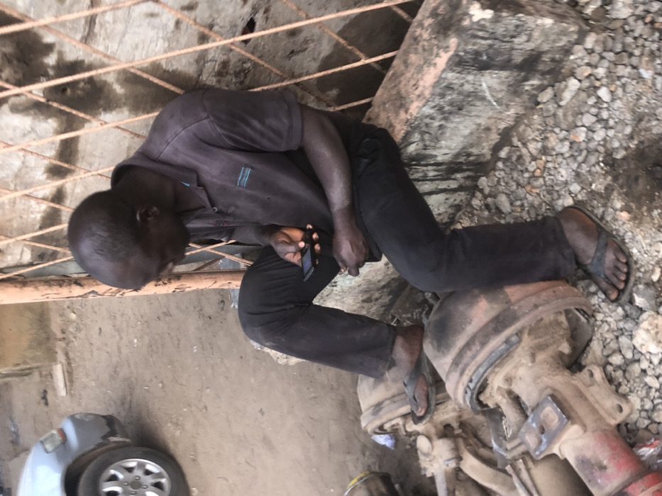 - "A man in dark clothing and sandals kneels among automotive parts and rubble, looking at a cell phone in his hand" by FM-IhhyI2, licensed under CC BY 4.0