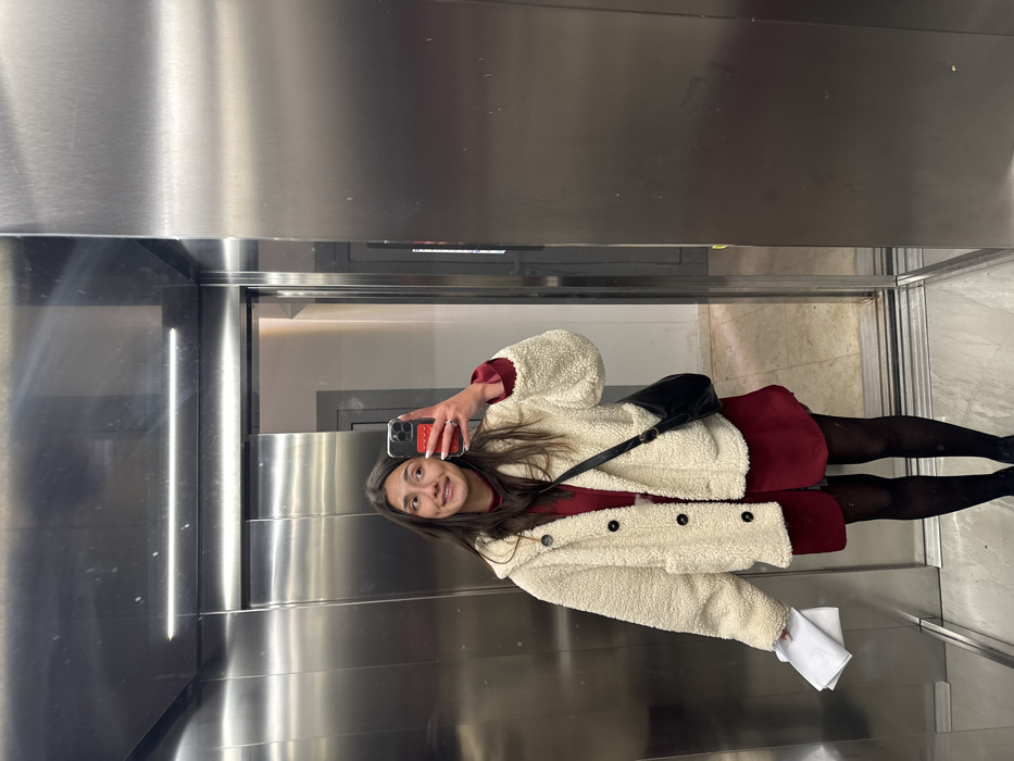 A young woman in an elevator takes a selfie. She wears a burgundy dress, black tights, and a cream-colored, button-down jacket. A black purse hangs across her shoulder. Her cell phone has a red case. The elevator has brushed metal walls and a marbled floor. She smiles at her reflection. A small, white object rests near her waist.