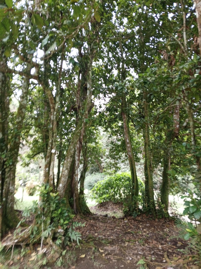 A dense grouping of trees fills the frame, their trunks varying in thickness and color from light to dark gray. Abundant green foliage covers the branches, creating a canopy that filters the sunlight. Below, the ground is covered in fallen leaves and a few scattered green plants. The scene evokes a sense of depth, with a glimpse of more greenery visible between the trees in the distance, giving the impression of a forest path or clearing.