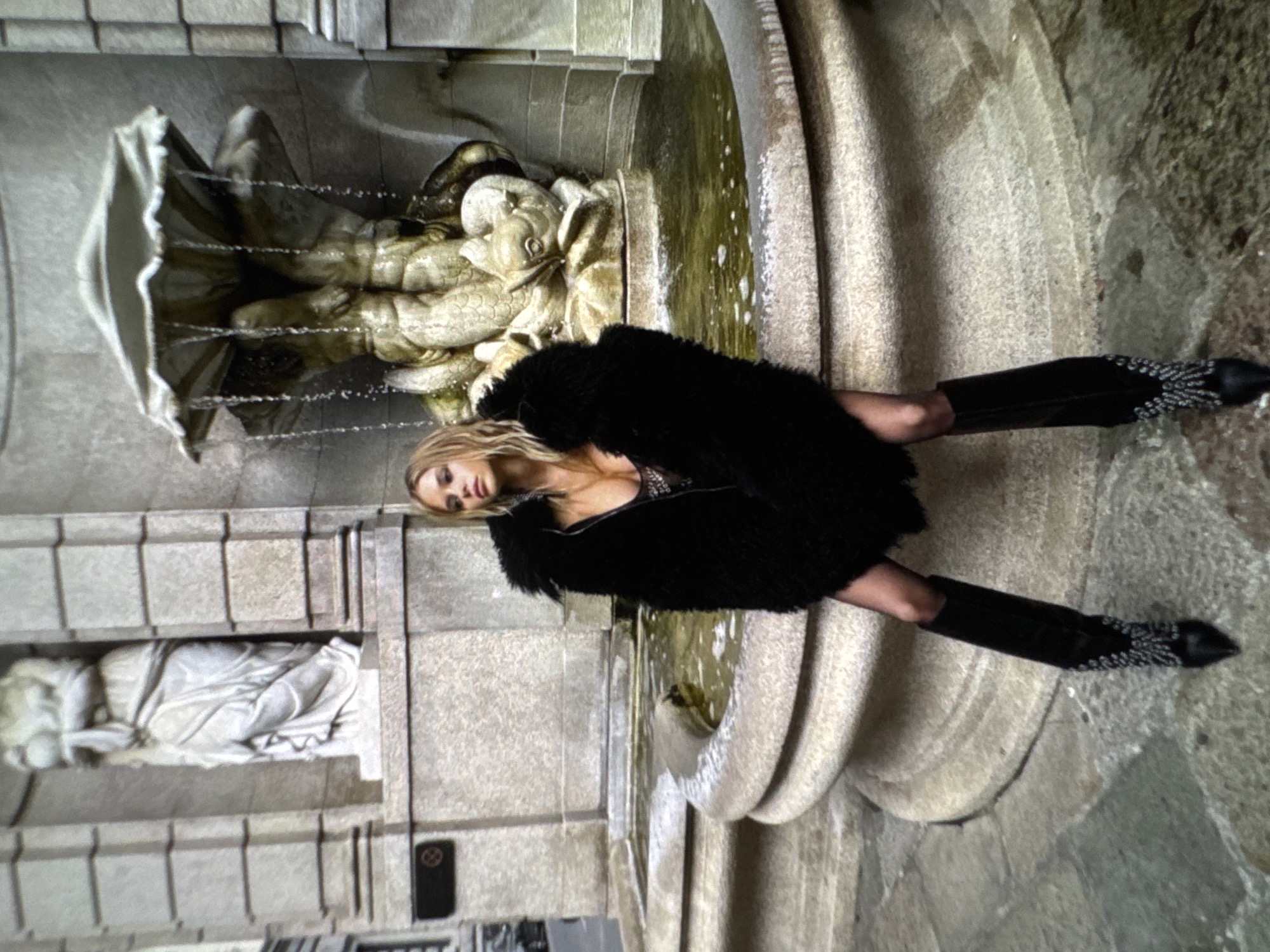 A woman is lying on the side of a stone fountain. She is wearing a black fur coat and black boots. The fountain has a sculpture of a figure in the basin. There is a stone statue of a figure on the left side of the image.