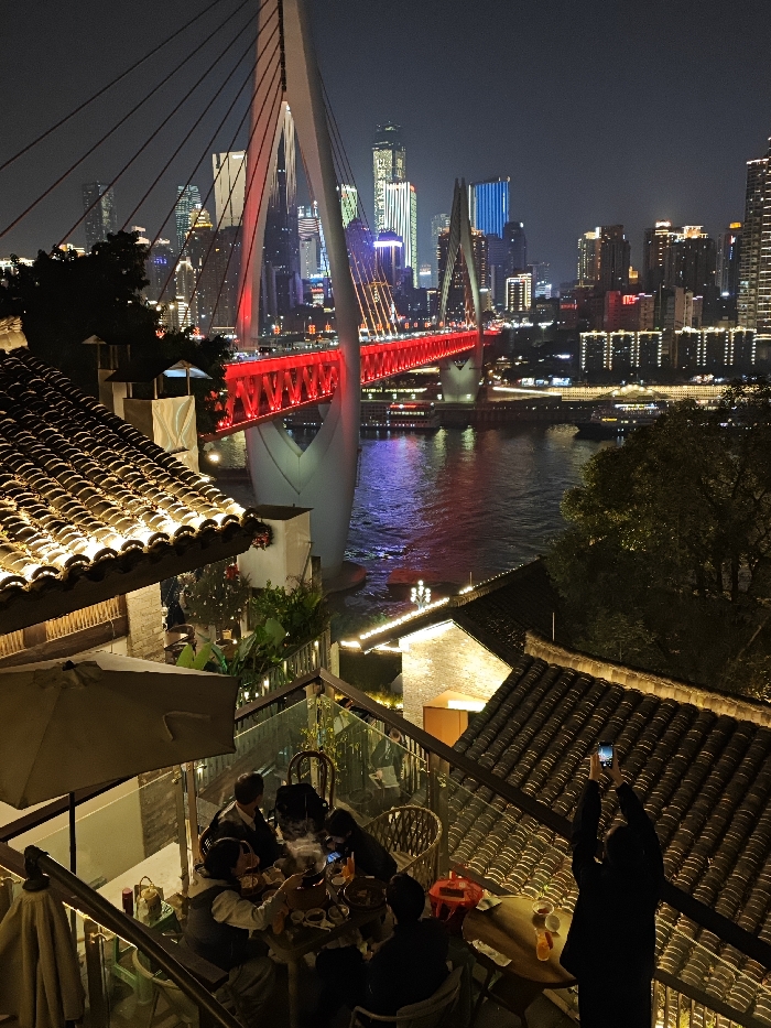 The image displays a nighttime scene overlooking an urban riverfront, viewed from a multi-level terrace specified to be in Nan'an District, Chongqing, China. In the immediate foreground, a group of five individuals is seated around a circular dining table on an outdoor terrace. They are engaged in a hotpot meal, indicated by a central steaming pot, multiple small serving dishes, and drinks. An off-white patio umbrella is partially retracted above this group. To their right, on an adjacent, higher terrace, a single individual, seen from behind, holds a smartphone vertically, pointing it towards the distant urban landscape, presumably capturing a photograph. A small round table with two glasses and a red container is positioned near this person. The midground features the Jialing River, reflecting blue and red artificial lights, crossed by the Qianximen Bridge. This bridge, a cable-stayed and truss structure, is distinctively illuminated with red lighting along its main span and white on its towers. The background consists of a dense cluster of high-rise buildings and skyscrapers in Yuzhong and Jiangbei Districts, brightly lit across the dark sky. Architectural elements of traditional Chinese tiled roofs, outlined with warm string lights, are visible on multiple terrace levels in the foreground and midground.