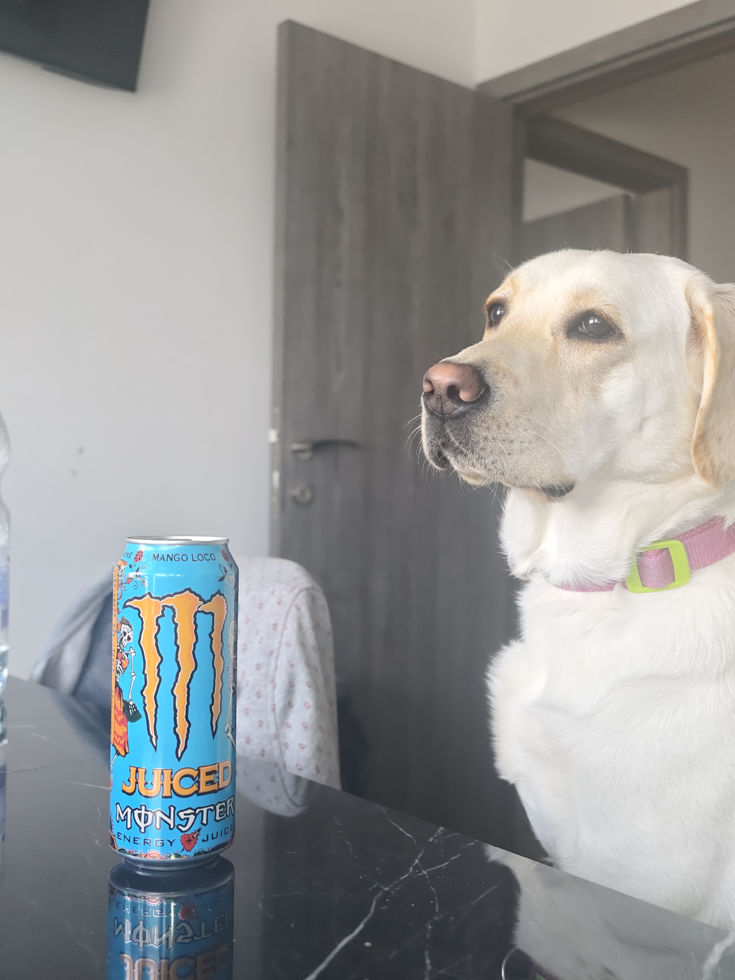 The image depicts a yellow Labrador Retriever dog sitting at a table indoors. On the table is an unopened can of "Juiced Monster" energy drink, Mango Loco flavor, with its reflection visible on the black marble tabletop. The background includes a gray door and a glimpse into another room. The specific location in Kozloduy, Bulgaria is not discernible from the provided image.