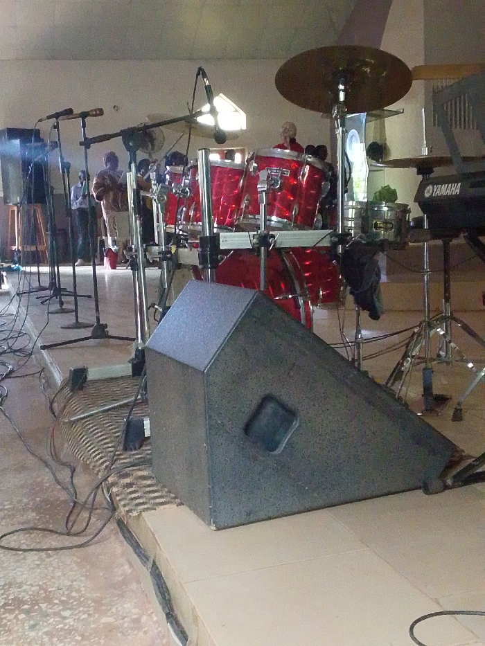 The image depicts an indoor musical performance setup on a raised stage in the city of Unknown, Unknown. In the immediate foreground, a dark gray, wedge-shaped floor monitor speaker rests on beige tiled flooring, its grill facing away from the viewer, angled upwards towards the background. Numerous black electrical cables are visible on the stage floor, trailing towards and off the edge of the platform. In the midground, a prominent, glossy red, multi-piece drum kit with chrome hardware is centrally positioned. A male individual, appearing to be the drummer, with light skin and a receding hairline, is seated behind the kit, wearing a red shirt. A large, brass-colored cymbal is mounted on a stand to the right of the drum kit, and several other cymbals and drum components are visible. To the far right, a black Yamaha brand electronic keyboard is visible on a stand. Multiple black microphone stands with attached microphones are arrayed across the stage, some positioned directly in front of the drum kit. A silver cylindrical container with green leafy material is situated on a stand near the right side of the drum kit. To the left of the drum kit, several other individuals are partially obscured; one person wears a light brown patterned garment, and another is visible in a light blue shirt. The background reveals a light-colored ceiling, possibly concrete or plaster, with a bright, rectangular light source or window illuminating the upper-mid section of the scene. The floor off-stage is a lighter, mottled concrete or tiled surface, with more cables extending across it. The overall scene suggests an active or prepared musical performance space.