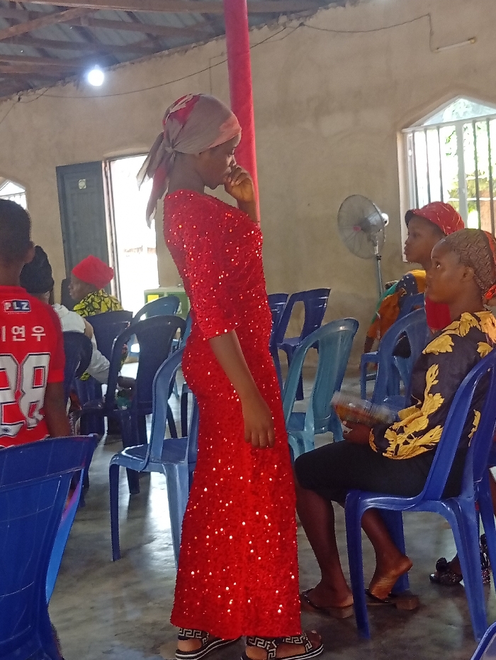 The scene depicts an indoor gathering in Isinyi-Nando, Nigeria. A young adult female stands centrally, facing left, attired in a full-length red sequined dress, a patterned headscarf, and black-and-white patterned sandals. Her right hand is positioned near her mouth. To her right, a second young adult female is seated on a blue plastic chair, wearing a black top with yellow patterns and holding a translucent plastic container. A third female, wearing a red head covering, is partially visible seated further right, adjacent to a grey pedestal fan. Multiple other individuals are partially visible, seated on similar blue plastic chairs throughout the utilitarian room. The environment features light grey, unfinished concrete walls, exposed wooden roof rafters, and a red-painted vertical support pillar. Natural light illuminates the space through windows with metal bars and a doorway. A bare light bulb hangs from the ceiling. A partially visible individual wearing a red and white shirt is seated in the left foreground.