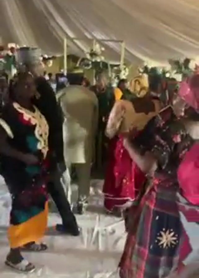 group of people dancing at what appears to be a wedding reception. The setting is inside a large tent with a white, draped ceiling. Many of the women are wearing colorful, patterned outfits and headwraps, suggesting cultural attire. Some men are also present, dressed in suits and traditional clothing. The group is moving and clapping along to music, indicating a celebratory atmosphere. The camera is positioned among the dancers, capturing the energy and movement of the event.