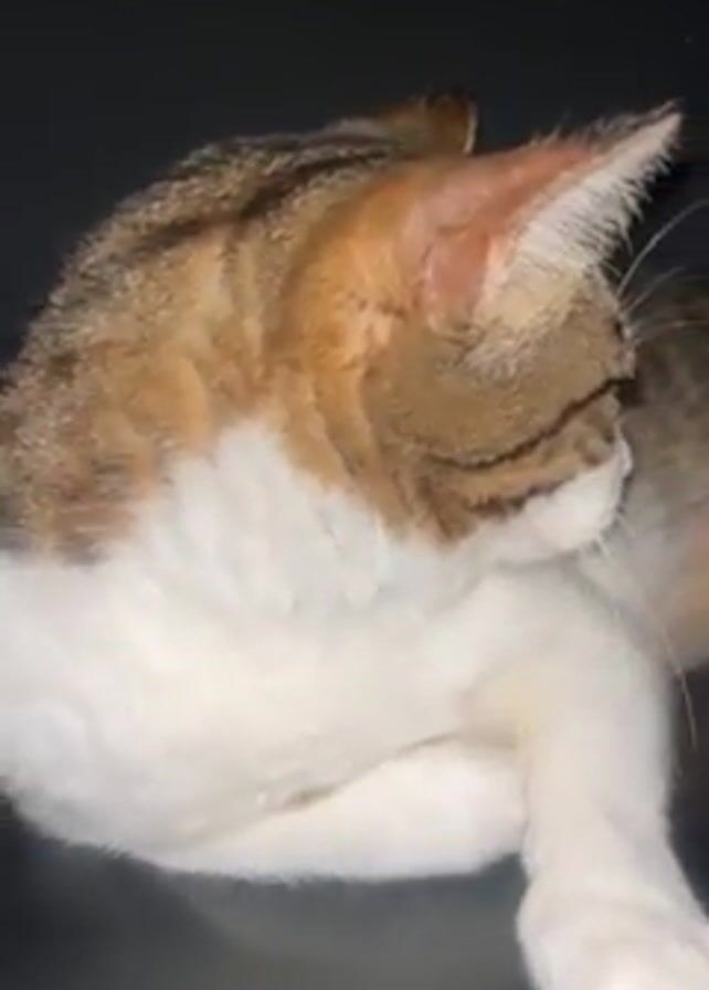 cat resting. The cat is white with brown and tan striped patches on its head and back. The cat is lying on a dark surface and appears to be looking up. The video briefly shows what seems to be a person's hand, but it is out of focus.