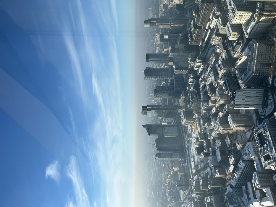 This image presents a high-altitude, panoramic view of the central business district of Warsaw, Poland, during winter. The vantage point is elevated, looking out over a densely packed urban landscape under a bright, clear blue sky with sparse, wispy cirrus clouds. The upper portion of the sky exhibits two prominent, parallel diagonal light reflections, indicating the photograph was taken through a glass window. The cityscape below is characterized by a significant concentration of modern skyscrapers and high-rise buildings, particularly in the middle ground, which includes recognizable structures such as the Varso Tower (with its distinct spire), the Warsaw Spire, and other glass and steel office towers. Surrounding these prominent structures, and extending into the foreground and mid-distance, is a vast expanse of lower-to-mid-rise commercial and residential buildings. A defining feature of the scene is the uniform, thin layer of snow covering the rooftops of nearly all the buildings and visible ground areas, contrasting with the darker facades of the structures. Roads and streets are discernible as dark lines winding between the snow-covered blocks. Towards the distant horizon, a noticeable atmospheric haze or smog blurs the urban details and softens the contrast, indicating a winter atmospheric condition. No individual people or specific actions are visible due to the extreme distance. The overall environment is cold, urban, and quiet, with natural light illuminating the scene from a high sun position.