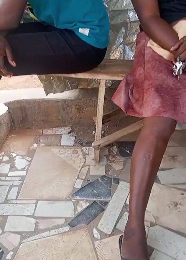 Two people are sitting on a wooden bench. The person on the left is wearing a teal t-shirt and dark pants. The person on the right is wearing a black t-shirt, a reddish-brown skirt, and black sandals. The floor is covered with a mosaic tile pattern. Behind the people is a wall covered in reflective material. The camera appears to be handheld.