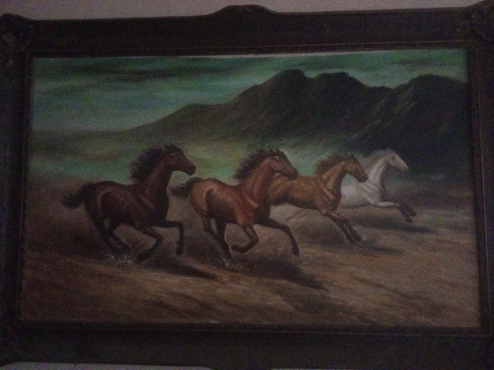 A photograph taken in the city of Zee Pin Kone, Myanmar, displays a framed painting of four horses running through a landscape