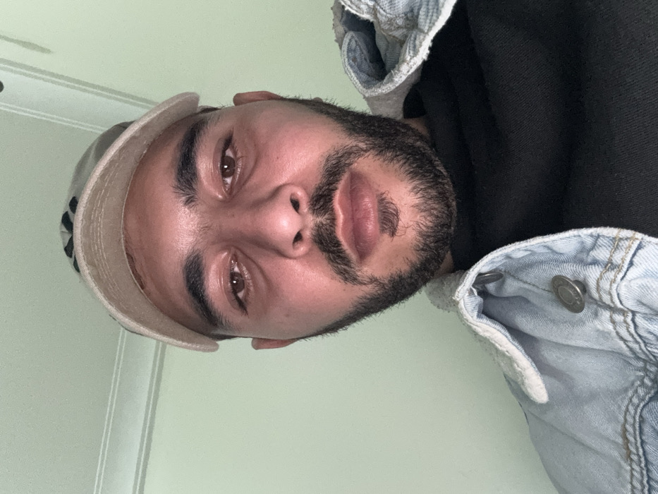 A man with brown eyes and a full beard is facing the camera. He is wearing a light-colored cap with black stripes on the brim and a denim jacket with a black shirt underneath. The wall behind him is a light green or beige color with a white trim visible in the lower left. The image is angled as if taken from a slightly elevated perspective.