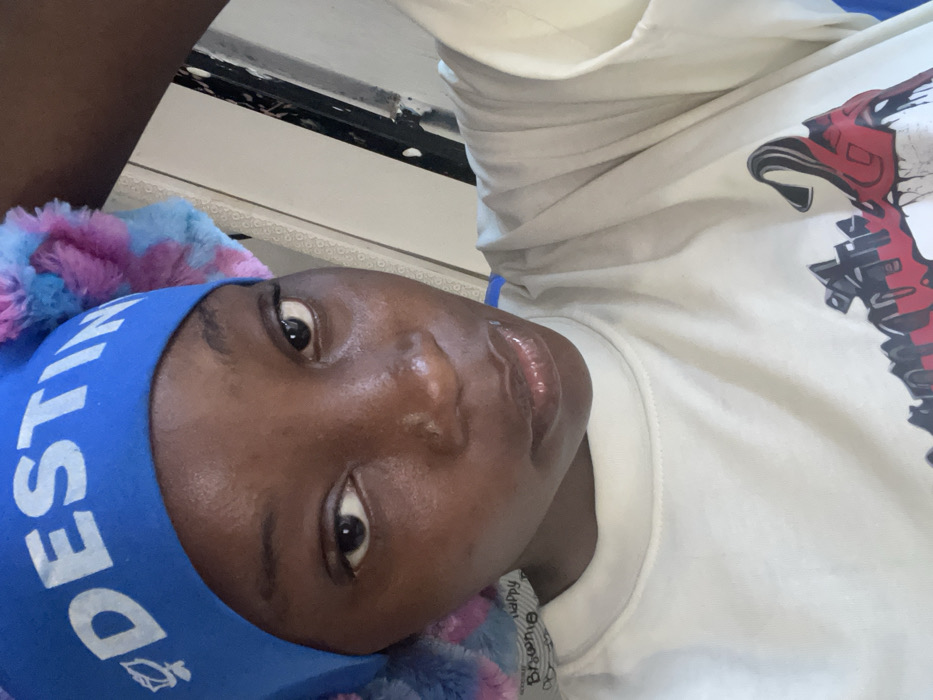A close-up, eye-level portrait shows a female individual with dark skin, dark eyes, and full, glossy lips, looking directly at the camera. She is wearing a bright blue cap with white text that partially reads "DESTINY" and features fluffy blue, pink, and purple material on the sides. Her hair is completely covered by the cap. She wears a light-colored (likely white or off-white) crew-neck t-shirt with a partially visible graphic design in red, black, and white on the lower front. The background is an interior setting with indistinct light-colored walls or surfaces, one of which shows faint, handwritten text including "happy Brownie." A darker, vertical element, possibly a doorframe or piece of furniture, is visible to the right. The scene is located in the city of Lokoja, Nigeria.