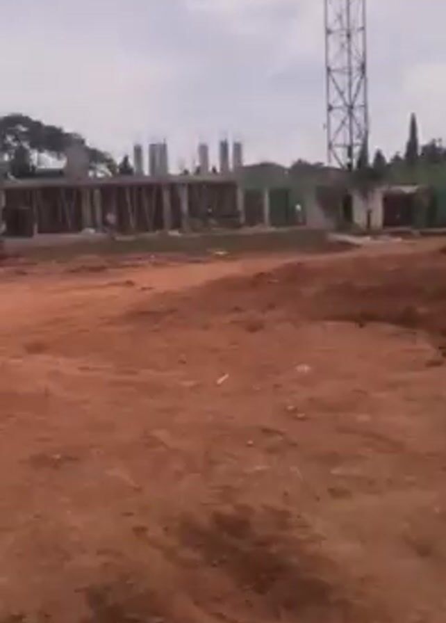 muddy construction site in front of stadium seating. The ground is bare dirt, with clumps of soil and tyre tracks. In the background, the stadium grandstand is visible, with metal benches and a covered roof. To the left and right of the stadium, there are construction areas with bare columns and incomplete walls. There is a light-colored pickup truck on the track, and in the distance, some trees and a tall communication tower are visible. The sky is overcast and hazy, suggesting it may be cloudy or a humid day.