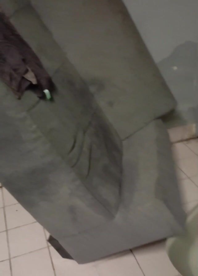 room, possibly a bathroom, with a gray sofa, white tiled floor, and pale green walls. There is a brown towel draped over the sofa. A light green object, potentially a small toy or a piece of trash, is also on the sofa. A light green, empty basin sits on the floor near the sofa. The sound of a baby crying is audible. The camera appears to be hand-held and the footage is somewhat shaky.